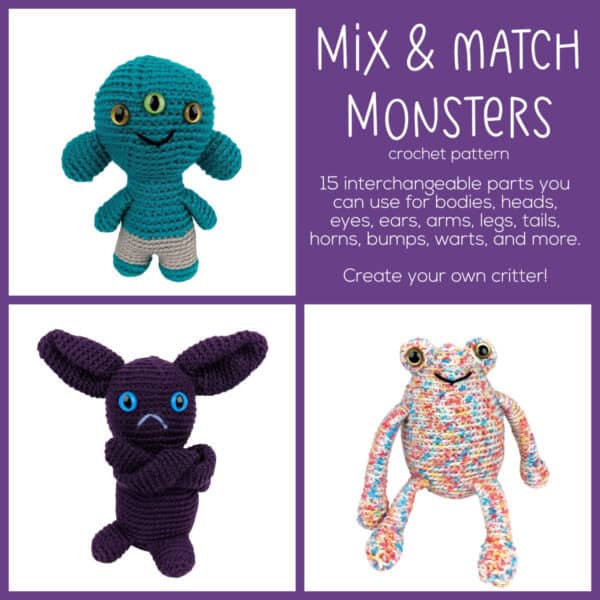 I’m so dang proud of this pattern! Not only does it have instructions for 15 parts you can mix and match to create your own monsters – the samples for those parts are color-coded to help you see how pieces are shaped. Increase rows are in one color, decrease rows are in another, and straight rows are in a third color. That makes it really easy to see how you can add or change rows to make a similar piece that’s skinnier, wider, longer, or shorter. If you’re interested in eventually designing your own patterns, this is a great intro.