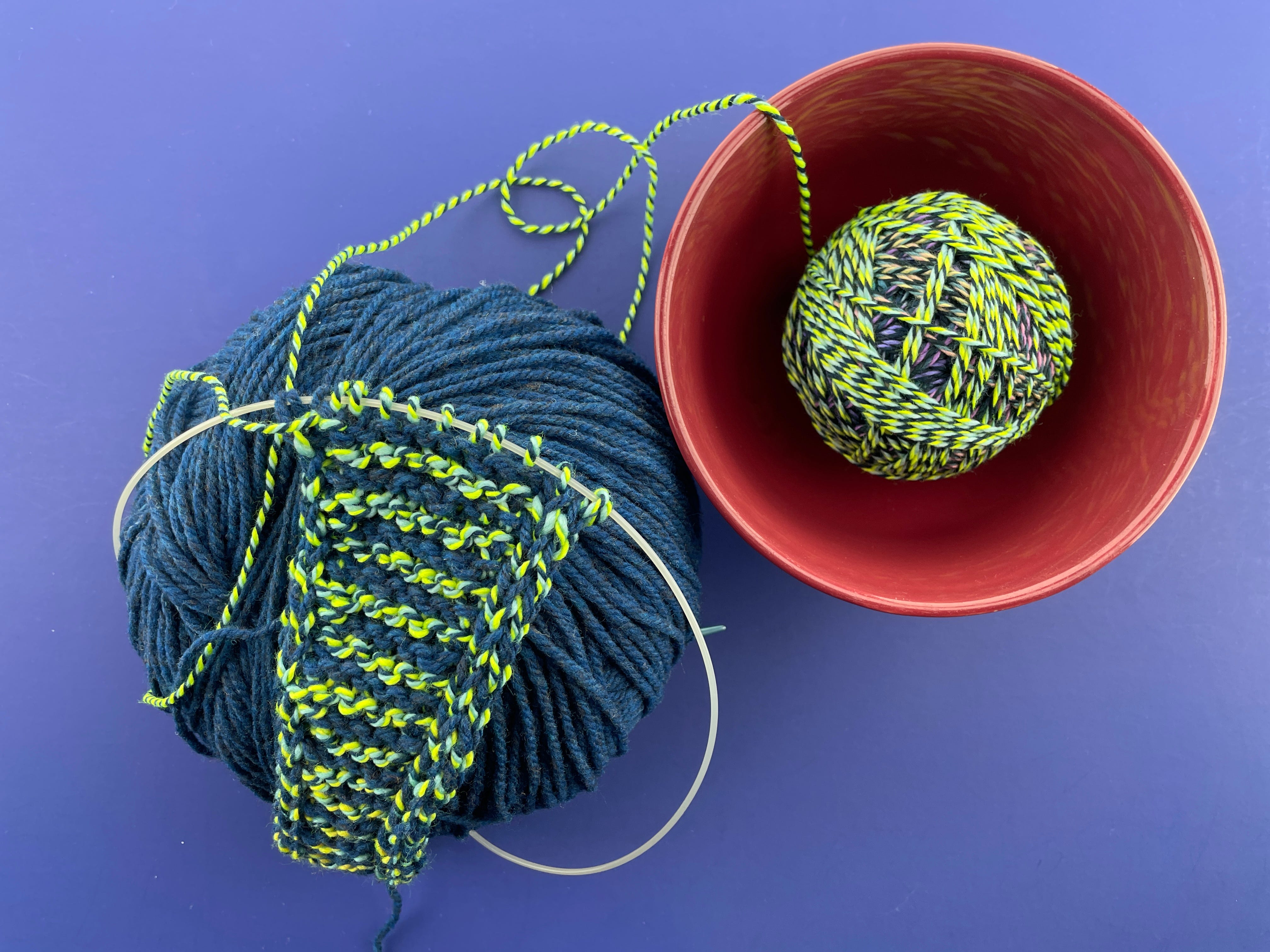- I highly recommend striping with two yarns. It’s not hard, and the stripes actually helped me keep track of where I was in the pattern at all times. That was especially helpful because I’m still learning how to “read” my knitting.